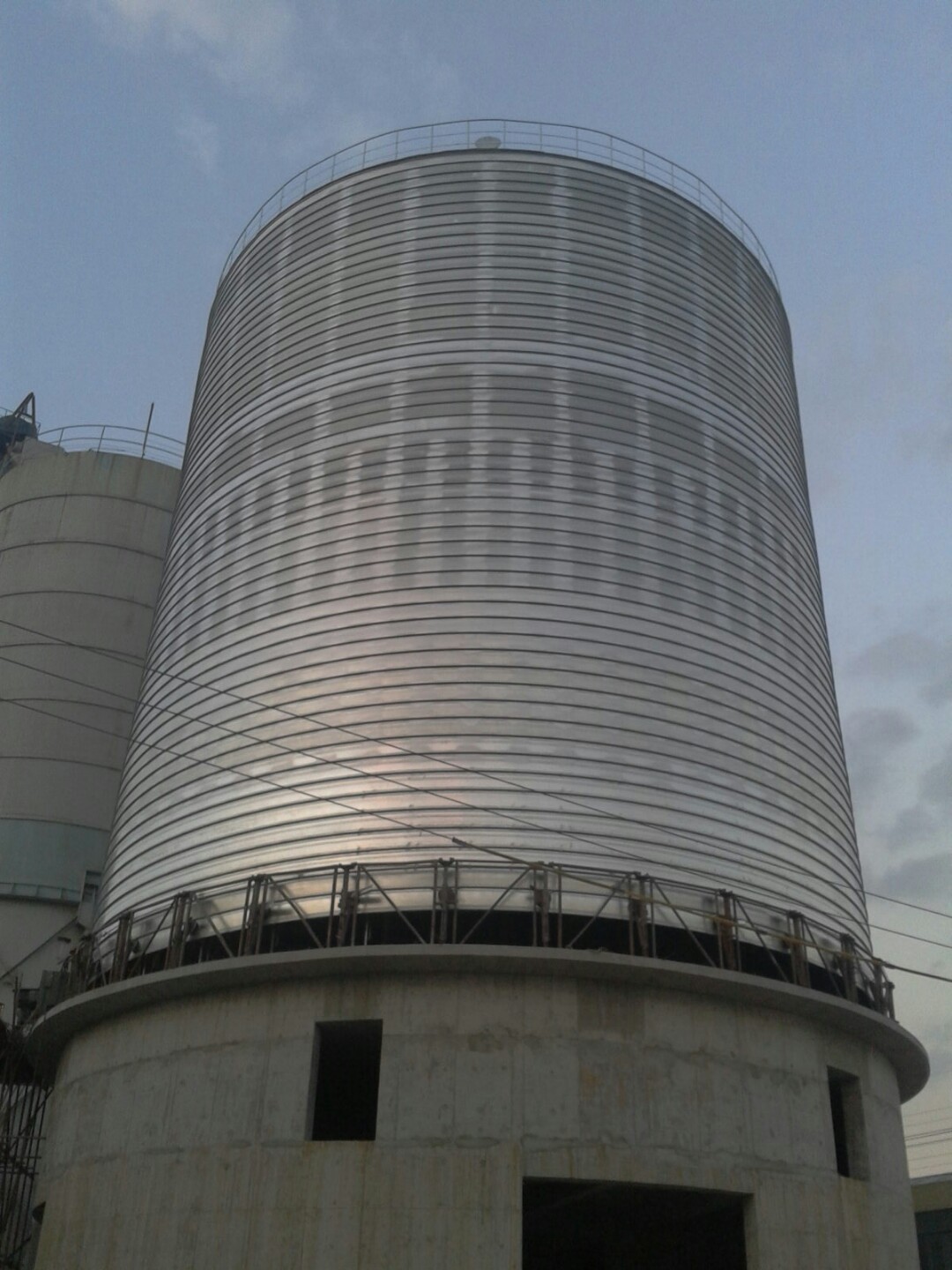 钢板仓在建造过程中,完全由专用设备施工,在卷制过程中,仓体外壁咬制成一条五倍于材料厚度 30mm-40mm宽的螺旋凸条,大大加强了仓体的承载能力,使钢板仓的整体强度、稳定性、抗震性优于其它池罐。另外,它采用的是防腐性能特别强的材料,这使得它的寿命也比其它池罐长。